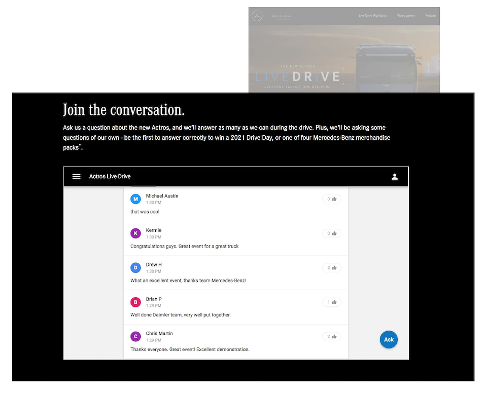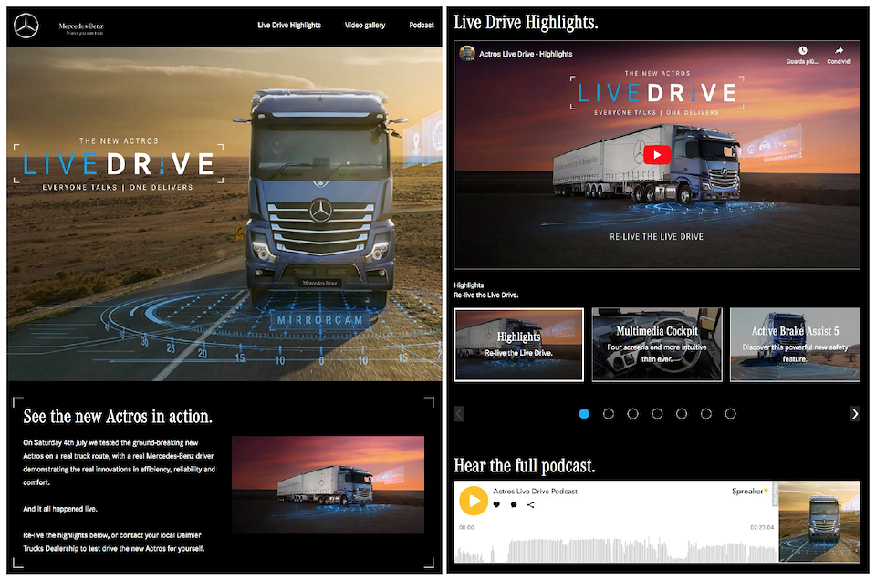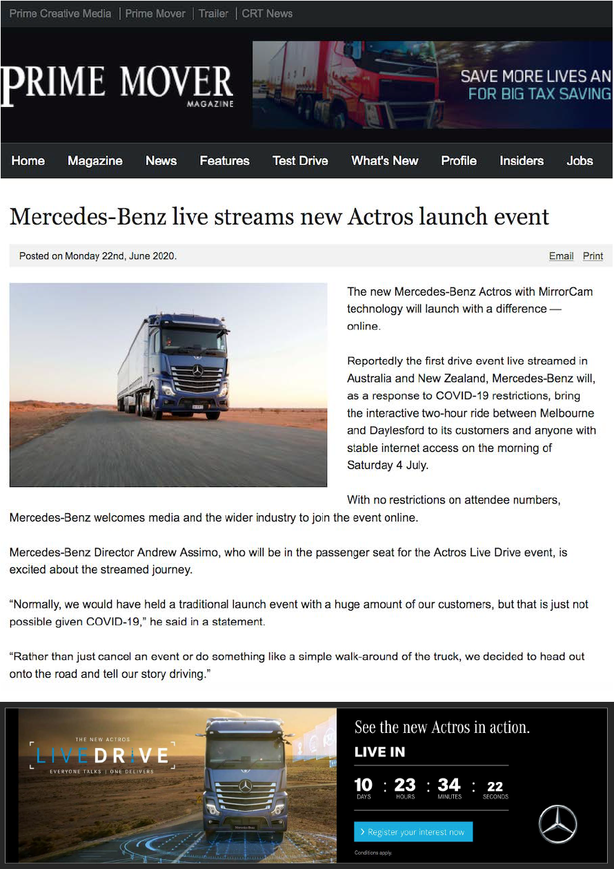 The Live Drive was a 2-hr interactive live streamed event across AU and NZ that took truckies along for the ride, as we drove on a real truck route with a truck driver, a presenter and Mercedes-Benz Marketing Director, test-driving the Actros' ground-breaking innovations.